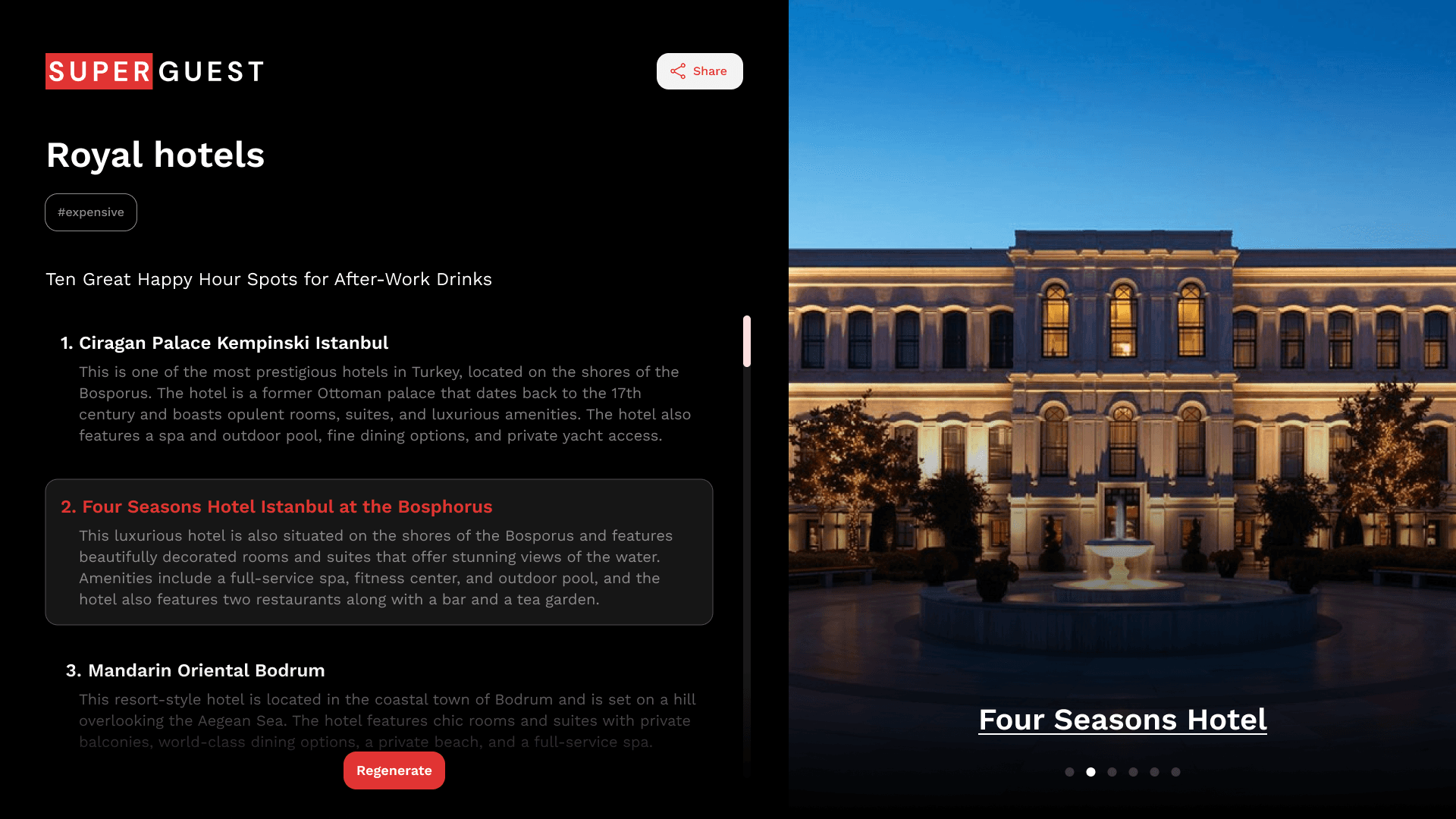 Hotel Search: SuperGuest enables users to search for hotels in their desired location using natural language queries. Users can enter their desired location, and SuperGuest will generate a list of top-rated hotels in that area.
